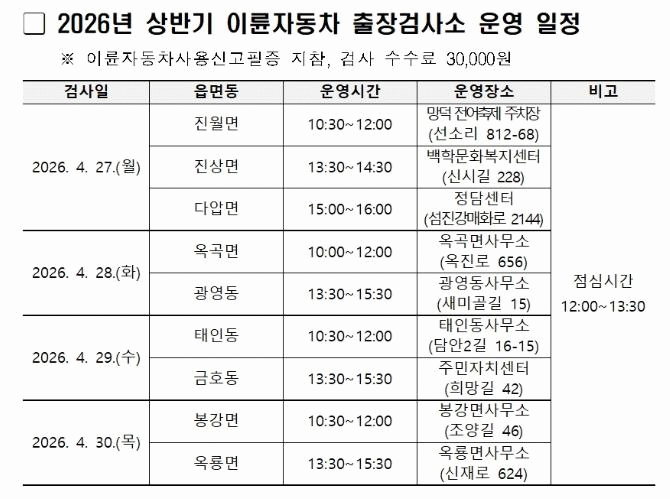 광양시 관계자는 “이륜자동차 정기검사는 배기가스 관리와 안전기준 준수를 위해 꼭 필요한 검사”라며 “검사소 방문이 어려운 주민들이 이번 출장검사소를 이용해 기간 내 검사를 받으시길 바란다”고 말했다.
