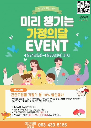 진안군 관계자는 “가족과 주변 지인들에게 따뜻한 마음을 전하는 가정의 달인 만큼, 진안고원이 키워낸 건강한 먹거리로 감사의 인사를 전하시길 바란다”며 “앞으로도 진안고원몰을 통해 생산자와 소비자가 상생할 수 있는 다양한 프로모션을 지속적으로 추진하겠다”고 말했다.