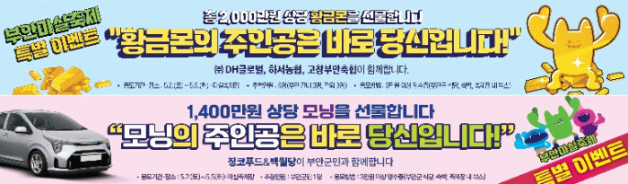 ‘황금몬을 선물합니다’는 부안군 대표축제 캐릭터 ‘부안몬 프렌즈’가 각인된 순금 3돈 상당의 카드형 골드바 6개를 제작해 부안 관내‧관외 3명씩 총 6명에게 추첨을 통해 증정하는 행사이며 ㈜DH글로벌, 하서농협, 고창부안축협의 후원을 받아 진행된다.