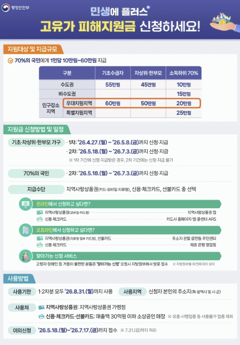 지급 금액은 인구감소지역 우대 기준을 적용해 기초수급자 60만 원, 차상위·한부모 및 소득 하위 70% 가구는 각 20만 원을 지급한다.
