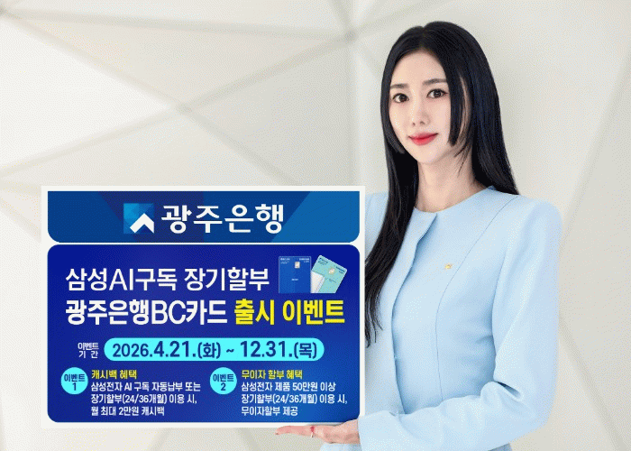 광주은행은 카드 출시를 기념해 2026년 12월 31일까지 이벤트를 진행한다. 행사기간 동안 삼성스토어에서 삼성전자 제품을 AI 구독클럽으로 구매하거나 24/36개월 장기할부로 구매할 경우, 무이자 할부 혜택은 물론 매월 카드 전월실적에 따라 AI 구독 자동납부 또는 장기할부 이용 범위 내에서 기본 캐시백 금액에 6,000원을 추가하여 매월 최대 2만원까지 캐시백 혜택을 제공한다.