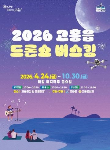 군 문화체육과 관계자는 “고흥읍 드론쇼 버스킹 공연이 군민과 관광객에게 일상 속 작은 쉼표가 되길 바란다”며 “앞으로도 군민들의 문화예술 향유 기회 확대를 위해 다양한 공연을 마련하겠다”고 말했다.