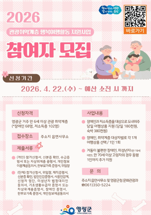 이번 사업은 영광군에 거주하는 만 6세 이상 장애인과 저소득층 주민 총 170명을 대상으로, 1인 기준 당일여행 18만 원, 1박2일 여행 38만 원까지 지원하며 4월 22일부터 예산액 32,300천 원 소진 시까지 신청접수를 하게 된다.