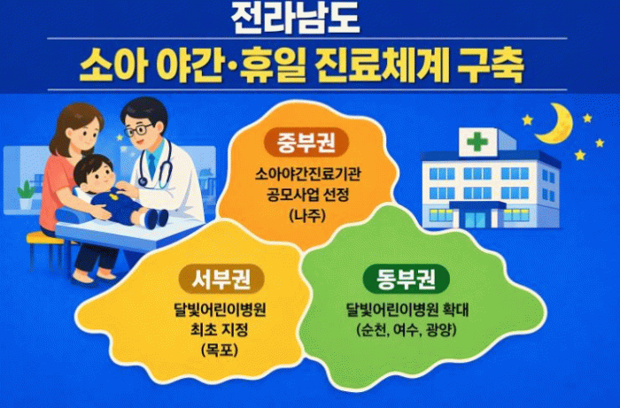 정광선 전남도 보건복지국장은 “아이를 키우는 부모 입장에서 가장 걱정되는 순간이 밤에 아플 때인데, 걱정을 조금이나마 덜어드리게 됐다”며 “앞으로도 도민이 체감할 소아 진료 환경을 지속해서 강화하겠다”고 말했다.