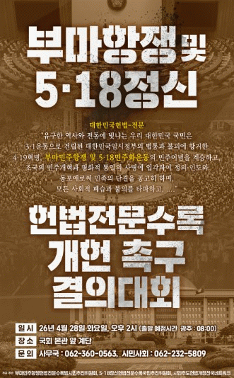 이날 국민결의대회는 5·18정신헌법전문수록국민추진위원회, 부마민주항쟁헌법전문수록범시민추진위원회, 시민주도헌법개정전국네트워크 등 3개 단체가 공동 주최·주관한다.
