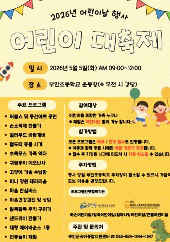 행사 당일 우천 시에는 부안초등학교 강당에서 체험부스와 공연만 진행된다.
