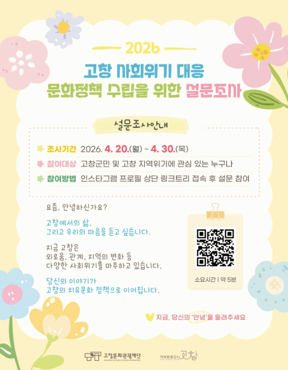 설문조사는 30일까지 진행되며, 고창군민을 비롯해 지역 위기에 관심 있는 누구나 참여할 수 있다.