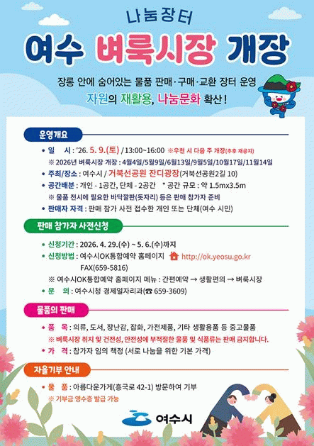 한편, 다음 여수 벼룩시장은 6월 13일 오후 1시부터 4시까지 같은 장소에서 개최될 예정이다.