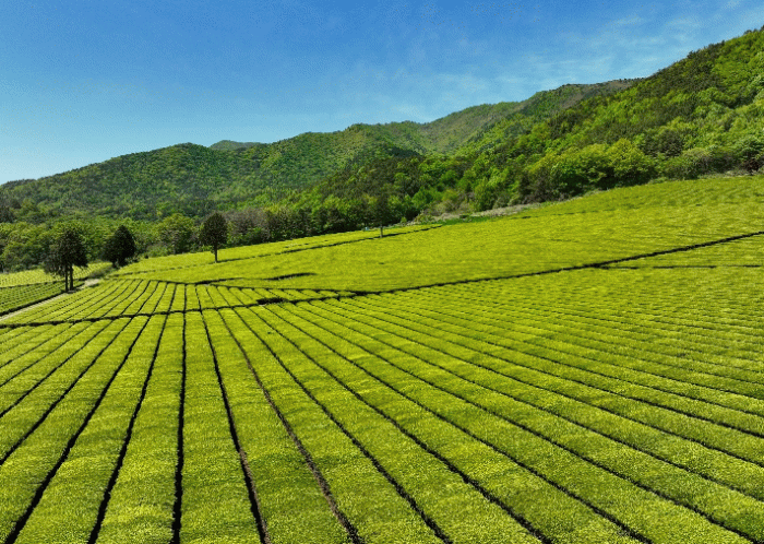 드넓게 펼쳐진 연두색 차밭이 짙푸른 산세와 조화를 이루며 마치 한 폭의 수채화를 그려낸 듯한 장관을 연출하고 있다.