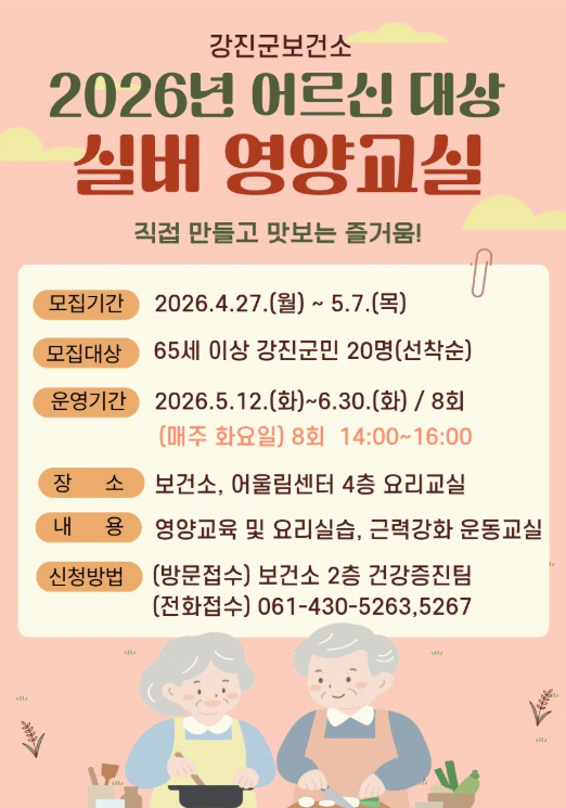강진군 관계자는 “어르신들이 노년기에 맞는 식생활 지침과 건강한 조리 방법을 배우며 스스로 건강을 관리할 수 있는 좋은 기회가 될 것”이라며 “이번 프로그램을 통해 주민들이 건강관리에 한 걸음 더 다가서고 활기찬 노년을 보내시길 바란다”고 말했다.