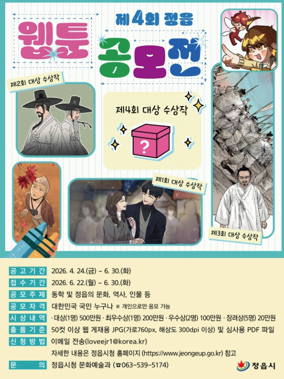 정읍시 관계자는 “지난 공모전들을 통해 정읍의 역사와 문화가 웹툰이라는 매체로 새롭게 조명되는 성과를 거뒀으며, 올해도 역량 있는 창작자들이 정읍의 풍부한 이야깃거리를 바탕으로 개성 넘치는 작품을 보여주길 기대한다.”고 밝혔다.