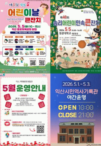 정헌율 익산시장은 "어린이날 연휴를 맞아 축제부터 이색 체험, 생태 힐링까지 모든 세대가 만족할 수 있는 콘텐츠를 내실 있게 준비했다"며 "익산의 아름다운 자연과 문화를 통해 가족과 함께 행복하고 소중한 추억을 만드시길 바란다"고 말했다.