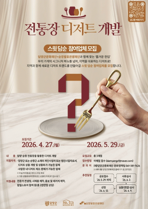 담양군문화재단 관계자는 “이번 사업은 지역의 전통 식재료를 활용해 새로운 디저트 트렌드를 만들어가는 시도”라며 “담양·순창 지역 사업자들의 많은 관심과 참여를 기대한다.”고 밝혔다.