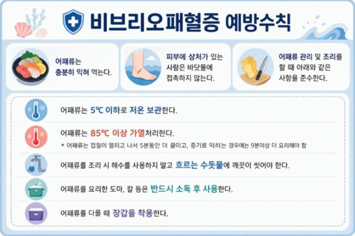비브리오패혈증 예방을 위해서는 어패류는 충분히 익혀 섭취하고 피부에 상처가 있는 경우 바닷물 접촉을 피해야 한다.