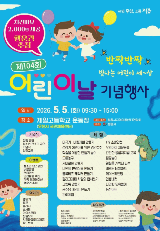 정읍시지역아동센터연합회가 주관하고 정읍시가 후원하는 이번 행사는 ‘반짝반짝 빛나는 어린이 세상’이라는 주제로 열린다. 오전 9시 30분 신나는 축하 공연을 시작으로 기념식과 다채로운 부대 행사가 어우러져 아이들의 오감을 만족시킬 예정이다.