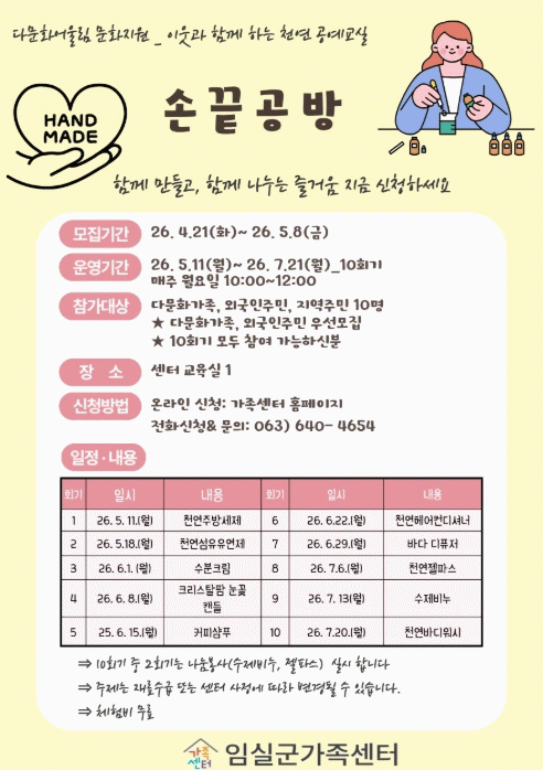 임실군 가족센터 관계자는 "손끝공방은 언어와 문화의 경계를 넘어 함께 만들고 나누는 과정에서 자연스럽게 이웃이 되는 프로그램"이라며 "지역 내 다문화가족과 외국인주민, 지역주민 모두의 많은 참여를 바란다"고 전했다.