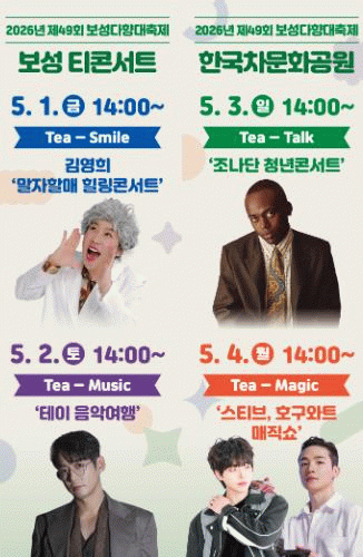 특히, 주무대 핵심 프로그램인 ‘보성 Tea-Concert’는 힐링·음악·소통·퍼포먼스를 결합한 공연 콘텐츠로, 날짜별 차별화된 라인업을 통해 축제의 집중도를 높였다.