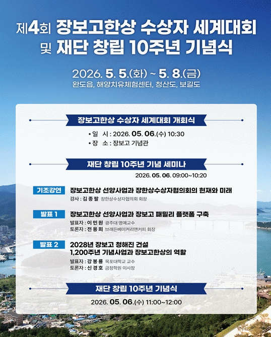 특히 6일 오전 9시 장보고기념관에서 ▲장보고한상 선양 사업과 장한상수상자협의회의 현재와 미래(김종팔 장한상수상자협의회 회장) ▲장보고한상 선양사업과 장보고패밀리플랫폼구축(이민원 전 국가균형발전 위원장, 전용희 브래든베이커리앤커피 회장) ▲2028년 장보고 청해진 건설 1,200주년 기념사업과 장보고한상의 역할(강봉룡 목포대학교 명예 교수, 신경호 금정학원 이사장)의 발표와 토론이 있을 예정이다.