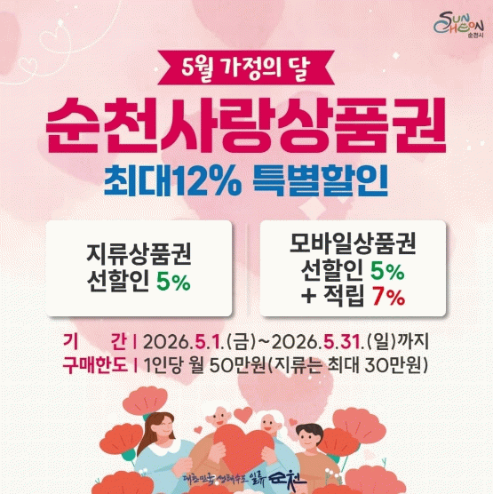 시 관계자는 “이번 순천사랑상품권 5월 할인행사는 전 시민 민생회복지원금 지급과 함께 시민들에게는 실질적인 소비 혜택을, 소상공인에게는 매출 증대의 기회를 제공하기 위해 마련했다”며 “지역에서 사용한 소비가 다시 지역 소상공인에게 힘이 되는 만큼, 순천사랑상품권 할인행사가 민생경제 회복의 마중물이 되길 기대한다”고 덧붙였다.
