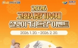 해남군 클릭뉴스2026. 01.21[클릭뉴스]장흥군은 설 명절을 앞두고 고향사랑기부제 활성화를 위해 1월 20일부터 2월 20일까지 ‘2026 설맞이 고향사랑기부제 더 드림 이벤트’를 진행한다. 이벤트 기간 중 ‘고향사랑e음’을 통해 장흥군에 10만 원 이상 기부하면 별도의 신청 절차 없이 자동으로 이벤트에 응모된다. 해당 조건을 충족한 기부자 전원에게는 모바일 상품권 5,000원이 경품으로 제공된다. 또한 이벤트 종료 후에는 무작위 추첨을 통해 10명을 선정, 5,000원권 모바일 상품권을 추가로 증정하는 혜택도 마련돼 있어 최대 1만 원 상당의 경품을 받을…