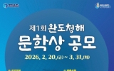 완주군 클릭뉴스2026. 02.26[클릭뉴스] ‘치유의 섬’ 완도군에서는 많은 사람들이 문학의 향기로 마음을 치유할 수 있도록 ‘제1회 완도 청해 문학상’ 공모전을 연다. 문학상 공모전은 완도가 지닌 ‘치유’를 문학의 영역으로 확장해 완도의 가치를 알리고 완도 문학의 저변을 넓히기 위해 마련됐다. 특히 공모전이 첫 회임에도 총 상금이 4,100만 원에 달하는 등 전국 규모의 수준으로 첫발을 내디딘다. 공모는 세 부문으로 진행된다. 일반부(20세 이상 국민) 참가 요건은 2년 이내에 출간(미 수상)한 시 또는 소설 1권, 청소년부(19세 이상 전남도…