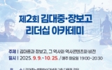 목포시 클릭뉴스2025. 09.08[클릭뉴스](재)김대중노벨평화상기념관은 오는 9일부터 *‘김대중과 장보고, 그 역사 및 역사콘텐츠와 비전’을 주제로 '2025 김대중·장보고 리더십 아카데미'를 개최한다. 이번 아카데미는 국립목포대학교 호남문화콘텐츠연구소, 도서문화연구원, (사)장보고글로벌재단과 함께 진행하며, 전라남도와 (재)한국학호남진흥원이 후원한다. 아카데미는 김대중노벨평화상기념관 2층 다목적강당에서 9월 9일부터 매주 화요일에 열린다. 주요 강의 일정은 다음과 같다. 강의 일정은 ▲9월 9일 강봉룡 목포대 교수의 장보고는 문무대왕 해양설계의 실현자…