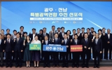 전라남도 클릭뉴스2025. 08.27[클릭뉴스]전라남도의회 김태균 의장은 8월 27일 나주시청에서 개최된 광주 · 전남 특별광역연합 선포식에 참석했다. 이날 선포식에는 김영록 지사와 김경수 지방시대 위원장 등 유관기관 관계자 100여 명이 참석한 가운데 그동안 진행되어 온 광주 · 전남 특별광역연합 추진 현황과 향후 계획 보고에 이어 공동협약 서명, 기념촬영 순으로 진행됐다. 김태균 의장은 이날 축사를 통해 “광주와 전남, 전남과 광주는 과거는 물론 현재까지도 늘 공동 번영을 위한 동반자였다”면서 “그러나 오늘날 우리는 인구감소와 지역소멸이라는 절박한 위기에 직면…