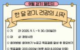 광양시 클릭뉴스2025. 08.27[클릭뉴스]광양시는 시민의 건강생활 실천을 장려하고 참여 확대를 도모하기 위해 오는 9월 1일부터 30일까지 모바일 걷기 앱 ‘워크온(WalkOn)’을 활용한 ‘9월 걷기 챌린지, 한 달 걷기, 건강의 시작’을 운영한다고 밝혔다. 걷기 챌린지는 워크온 앱을 기반으로 참여자가 걸은 만큼 마일리지가 적립되는 방식으로 진행된다. 1걸음당 1마일리지가 누적되며, 1일 최대 8,000마일리지까지 적립된다. 참여자가 챌린지 기간 중 총 20만 보를 걸으면 20만 마일리지가 쌓이며, 모바일상품권(5,000원권) 응모 자격이 주어진다. …