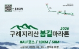 구례군 클릭뉴스2026. 02.23[클릭뉴스]전남 구례군은 아름다운 자연환경을 배경으로 한 ‘제1회 구례 지리산봄길 마라톤대회’가 오는 5월 2일 구례공설운동장에서 개최된다고 밝혔다. 이번 대회는 오마이뉴스 광주전라본부와 구례군육상연맹이 주최·주관하고 구례군이 후원하는 행사로 마라톤 종목 저변 확대와 구례 지역 홍보를 위해 마련됐다. 대회종목은 하프코스(21.0975km), 10km, 5km 총 3개 부문이다. 참가자들은 오전 8시 30분부터 순차적으로 출발해 지리산의 봄 풍경을 따라 달리게 된다. 참가 신청은 2월 23일부터 공식 홈페이지를 통해 접수를 시작…