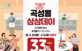 광주광역시 클릭뉴스2026. 02.23[클릭뉴스] 전남 곡성군은 3월 3일 삼겹살데이를 맞아 곡성군 공식 온라인 쇼핑몰 ‘곡성몰’에서 ‘삼삼데이 특별전’을 운영한다고 23일 밝혔다. 이번 특별전은 축산물 소비가 증가하는 시기에 맞춰 지역 축산농가의 판매 기반을 확대하고, 소비자에게는 우수한 지역 축산물을 합리적인 가격에 제공하기 위해 마련됐다. 참여업체의 자체 할인과 곡성군의 추가 할인 지원을 결합해 최대 33% 할인 혜택을 제공한다. 이번 행사에는 5개 업체가 참여해 한우, 흑돼지, 떡갈비, 유정란 등 총 27개 품목을 선보인다. 곡성몰 내에는 전용…