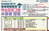 문화 클릭뉴스2026. 02.19[클릭뉴스]여수시 여성문화회관에서 진행하는 ‘제1기 여성문화회관 학습프로그램’ 수강생을 오늘(19일)부터 25일까지 5일간 수강인원 전원을 선착순으로 모집한다. 모집 과목은 ▲양재, 제과제빵, 홈패션 등 기능반 8개 ▲한지공예, 오카리나, 캘리그라피 등 취미반 17개 ▲의류수선, 생활요리, 플루트 등 야간반 12개 등 37개 과목이다. 이 중 밸리댄스, 소도구 필라테스, 여성합창, 체형교정발레 4개 과목은 여성 전용 수강 과목이다. 모집인원은 573명으로 교육 기간은 3월 2일부터 5월 29일까지다. 여수시에 거주하는 시…