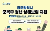 광주광역시 클릭뉴스2026. 02.17[클릭뉴스]광주광역시는 지난해에 이어 올해에도 광주 청년들이 국방의무에 전념할 수 있도록 ‘군복무 청년 상해보험 가입’을 지원한다. 지원 대상은 광주광역시에 주민등록을 둔 군복무 청년으로, 병역법에 따른 현역병, 상근예비역, 의무경찰, 의무소방원이다. 다만 보험 제도가 이미 마련된 직업군인, 사회복무요원 등은 대상에서 제외된다. 현역 군복무 청년이면 별도 신청 절차 없이 군복무 시작과 동시에 자동 가입되며, 전역이나 다른 지역으로 전출하면 해지된다. 주요 보장 항목은 ▲상해·질병 사망 및 후유장해(3000만원) ▲상해·질병 입…