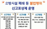 나주시 클릭뉴스2025. 05.16[클릭뉴스]나주소방서는 소방시설 불법행위를 근절하고 자율적인 안전문화를 정착시키기 위해 연중 ‘불법행위 신고포상제’를 운영하고 있다고 밝혔다. 신고포상제는 다중이용업소, 대형마트, 전문점, 백화점, 쇼핑센터, 복합쇼핑몰, 판매시설, 숙박시설 등 총 9개 업종을 대상으로 하며, 소방시설을 고의로 폐쇄하거나 차단하는 행위(예: 소방시설 잠금 등)와 같은 소방 관련 불법행위를 신고할 수 있다. 신고는 국민신문고 또는 나주소방서 누리집을 통해 접수할 수 있으며, 신고 내용이 사실로 확인되고 지급 요건을 충족할 경우, 건당 5만 원 상당…