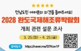 김제시 클릭뉴스2025. 03.28[클릭뉴스]완도군은 ‘2028완도국제해조류박람회’에 대한 전남도민 인식 설문 조사를 4월 25일까지 실시한다. 군은 설문 조사를 통해 박람회에 대한 도민 관심도와 기대 효과, 참여 의향 등을 분석하여 국제 행사 승인을 위한 자료로 활용할 계획이다. 설문 항목은 국제해조류박람회에 대한 인지도 및 관심도, 전남 해조류 산업의 글로벌 경쟁력 가능성, 참여 희망 콘텐츠 및 프로그램 유형 등 35개이다. 설문 조사는 온라인 또는 QR코드를 통해 모바일로도 할 수 있다. 군 관계자는 “설문조사는 2028완도국제해조류박람회…
