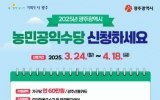 문화 클릭뉴스2025. 03.19[클릭뉴스]광주광역시는 오는 24일부터 4월18일까지 주소지 동 행정복지센터에서 ‘2025년 농민공익수당’을 신청받는다. 신청 대상은 2024년 1월1일 이전부터 계속해 광주시에 주소와 농업경영정보(농지‧농장)을 두고 실제 농업에 종사하고 있으면서, 전년도에 기본형직불금을 지급받은 농업경영체 경영주 또는 가축·곤충 사육 농업경영체 경영주이다. 단, 농업경영체 공동경영주, 부부 또는 동일 세대이면서 경영체를 분리해 여러 건으로 등록한 경우 한 사람만 신청할 수 있다. 또, 2023년도 농업 외 종합소득이 연 3700만원 이상이거…