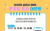 순천시 클릭뉴스2025. 12.15[클릭뉴스]순천시는 시 공식 SNS 채널 이용자들을 대상으로 ‘2025년 순천시 SNS 만족도 조사 이벤트’를 개최한다고 밝혔다. 이번 행사는 시민들이 시정 소식을 보다 쉽고 재미있게 접할 수 있도록 운영 중인 순천시 공식 SNS 채널에 대해 만족도를 조사하고, SNS 참여형 이벤트를 통해 소통을 강화하기 위해 마련됐다. 참여 방법은 시에서 운영하는 SNS 채널 유튜브와 당근마켓을 구독한 후, 온라인 설문조사에 응한 이용자를 대상으로 진행된다. 설문조사와 이벤트는 15일부터 26일까지 운영될 예정이며, 추첨을 통해 250명에…