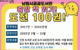 남원시 클릭뉴스2026. 02.03[클릭뉴스]남원시공공도서관에서는 어린이들에게 책 읽기의 즐거움과 독서 습관 형성을 위하여 2월부터 11월까지 ‘출발 책 읽기 도전 100권’ 프로그램을 운영한다. 이 프로그램은 어린이가 스스로 선정한 그림책 80권과 사서가 추천한 그림책 20권을 모두 읽으면 목표를 달성하는 것으로, 어린이들에게 성취감 및 자기 주도적 독서 습관을 기르고 도서관 이용 활성화를 위해 마련됐다. 시민 중 2017년~2022년생 누구나 참여할 수 있으며, 기존 초등 2학년까지였던 대상을 올해는 3학년까지 한 학년 확대해 기회의 폭을 넓히고자 한다. …