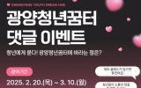 광양시 클릭뉴스2025. 02.21[클릭뉴스]광양시와 광양청년꿈터가 지역 청년들의 목소리를 직접 듣기 위해 오는 3월 10일까지 ‘양청년꿈터 댓글 이벤트’를 진행한다. 광양시에 거주하는 18세부터 45세까지의 청년이라면 누구나 이번 이벤트에 참여할 수 있다. 참여 방법은 간단하다. 먼저 광양청년꿈터 인스타그램을 팔로우하거나 네이버 블로그를 이웃 추가한 뒤, ‘광양청년꿈터에 바라는 점’ 게시글에 희망 프로그램이나 청년정책에 대한 의견을 댓글로 작성하면 된다. 이후, 팔로우 인증과 댓글 작성 화면을 네이버 폼으로 제출하면 참여가 완료된다. 휴대전화 번호당 1…