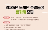 진안군 클릭뉴스2025. 02.21[클릭뉴스]광양시가 ‘2025년 도시민 주말농장’ 참가자를 모집한다. 주말농장은 시민들이 직접 텃밭을 가꾸며 농업을 체험할 수 있도록 지원하는 사업이다. 농장은 광양시 농업기술센터가 퇴비와 비료 사용, 경운, 구획 정리 등 기본적인 기반 조성을 담당하고, 참가자는 모종, 종자 및 소농기구 등을 개별적으로 준비해 자율적으로 텃밭을 가꾸는 방식으로 운영된다. 올해 주말농장 운영 기간(경작 기간)은 오는 4월부터 12월까지다. 규모는 총 160구획이며 ▲ 일반 텃밭 100구획 ▲ 은퇴자 텃밭 20구획 ▲ 다자녀가정 텃밭 20…