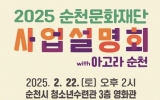순천시 클릭뉴스2025. 02.20[클릭뉴스]순천문화재단은 오는 22일 오후 2시, 순천시 청소년수련관 3층 영화관에서 ‘2025 순천문화재단 사업설명회 with 아고라순천’을 개최한다고 밝혔다. 이번 설명회는 순천의 문화예술인과 시민들에게 2025년 주요 사업을 소개하고 문화도시 주체로서의 운영 방향을 공유하는 자리로써, 특히 올해는 두 가지 중요한 변화가 주목된다. 순천문화재단의 대표 사업인 ‘항꾼에 즐기는 아고라 순천’의 사업설명회를 함께 진행하여 더욱 풍성한 논의의 장을 마련한다. 아고라 순천은 전국 유일한 연간 공연시스템으로, 지역 예술인과 시민들이…
