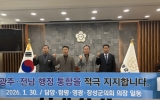 장성군 클릭뉴스2026. 01.30[클릭뉴스]담양군의회가 인구 소멸 위기 극복과 지역 경쟁력 강화를 위해 인근 의회와 손을 맞잡고 광주-전남 행정통합 추진에 힘을 보탰다. 담양·함평·영광·장성군 의장단은 ‘광주-전남 행정통합 염원 공동 퍼포먼스’를 펼치며, 행정구역의 경계를 넘어선 초광역 협력 체계 구축에 대한 강력한 의지를 표명했다. 이번 퍼포먼스는 단순한 선언을 넘어, 광주와 전남이 하나의 생활권이자 경제권으로 재편되어야만 수도권 집중화에 대응하고 자생적인 발전 동력을 얻을 수 있다는 절박한 공감대 속에서 마련됐다. 참석한 의장단은 성명을 통해 …