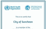 순천시 클릭뉴스2025. 02.10[클릭뉴스]순천시는 세계보건기구(WHO)로부터 고령친화도시 국제네트워크 재인증을 받아 2029년까지 자격을 유지한다고 10일 밝혔다. 고령친화도시 국제네트워크는 고령화에 효과적으로 대응하기 위해 세계보건기구가 2006년부터 추진해 오고 있는 범세계적 프로젝트이다. 시는 지난 2022년 WHO 고령친화도시 최초 가입 인증과 함께 3개년 실행계획을 수립하고, 중점사항으로 외부환경 및 시설 개선, 교통수단 편의성 제고, 건강과 지역사회 돌봄, 여가 및 사회활동 참여 등 8대 영역을 추진하며 노인복지를 위한 다각적인 노력을 기울여 …