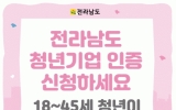 전라남도 클릭뉴스2025. 01.30[클릭뉴스]전라남도는 지방소멸 위기 극복과 청년이 기업하기 좋은 환경 조성을 목표로 2025년 전라남도 청년기업 인증제도를 본격 시행한다고 밝혔다. 청년기업 인증제도는 지역 청년기업의 활동을 적극 지원함으로써 청년 인구 유출을 막고 지역 경제에 활력을 불어넣기 위해 ‘전라남도 청년기업 육성 및 지원조례’를 근거로 마련됐다. 청년기업 인증은 전남에 소재하고 중소기업기본법 기준에 의한 중소기업이어야 하며 18~45세의 청년(2007~1979년생)이 대표인 기업 중에 국세 및 지방세 체납이 없고, 현재 정상적으로 운영 중인 기업이면 …