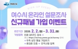 경제 클릭뉴스2026. 03.18[클릭뉴스]여수시가 오는 3월 31일까지 ‘온라인 설문조사 신규 패널 가입 이벤트’를 실시한다고 밝혔다. 시에 따르면 시정 정책 전반에 시민의 의견 수렴하기 위해 온라인 설문조사를 추진 중이며 ‘온라인 설문조사 패널’에 가입하면 각종 설문조사에 참여할 수 있다. 이벤트 기간은 오는 3월 31일까지이며 여수시민이면 누구나 가입 가능하다. 패널 가입은 이벤트 기간 이후에도 연중 가입할 수 있다. 가입 방법은 아래 QR코드를 통해 접속하거나 여수시 온라인 설문조사 누리집에 접속한 뒤 우측 상단 ‘패널 가입하기’를 클릭해 휴대폰 인증…