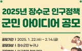 장수군 클릭뉴스2025. 01.24[클릭뉴스] 장수군이 오는 2월 14일까지 ‘2025년 인구정책 군민 아이디어 공모’에 나선다. 지방소멸 위기에 대응하기 위해 장수군에 꼭 필요한 정책을 군민들이 직접 제안할 수 있는 이번 공모는 정주 여건 개선은 물론이고 지역에 활력을 불어넣을 수 있는 생활인구 유입 방안과 같이 다양한 주제의 제안이 가능하다. 특히 기존의 정주 여건 개선을 위한 제안에서 더 나아가 △저출산 대응 △생활인구 유입 △경제활동인구 확충 △고령사회 대비 △지역 공동체 조성과 같이 군정 전반에 이르는 폭넓은 아이디어를 제안할 수 있어 눈길을 끈다.…