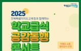 교육 클릭뉴스2025. 11.17[클릭뉴스] 전북특별자치도교육청이 학교급식에 대한 교육공동체의 다양한 의견을 수렴하는 시간을 가졌다. 전북교육청은 17일 오후 2시 전주 치명자산성지 평화의전당에서 학생·학부모·교직원 등 교육공동체 100여 명이 함께하는 ‘2025. 학교급식 공감동행 콘서트’를 개최했다. 이 행사는 학교급식 정책 및 현안에 대해 학생과 학부모는 물론 교직원까지 다양한 현장 의견을 수렴해 현장 적합성이 높은 학교급식 정책을 수립하기 위해 마련됐다. 주요 내용으로는 학교급식 정책방향 설명과 외부 전문가 특강, 전문 퍼실리테이터와 함께하…