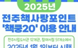 [클릭뉴스]전주시는 시민들이 도서를 구입할 때 정가의 20%를 할인받을 수 있는 전주책사랑포인트 ‘책쿵20’ 서비스가 2025년 새해 첫날부터 재개된다고 30일 밝혔다. ‘책쿵20’은 전주시에 주소를 둔 전주시립도서관 회원이라면 서비스 가입 후 참여서점에서 도서 구매 시 정가의 20%를 포인트(원)로 지급 받고, 즉시 사용해 책값을 할인받을 수 있는 제도다. 참여서점에서는 참고서, 문제집, 잡지, 전집 등 일부 도서를 제외한 도서 구매 시 정가의 20%를 할인받을 수 있으며, 1인 월 최대 3만 포인트(원)까지 사용할 수 있다.…