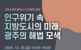 광주광역시 클릭뉴스2024. 12.19[클릭뉴스]청년인구 유출과 저출생 가속화 등 인구 감소 위기 속에서 광주의 인구문제를 진단하고 해법을 모색하는 장이 마련된다. 광주광역시는 광주연구원과 함께 20일 오후 2시 시청 무등홀에서 ‘2024년 광주시 인구정책 포럼’을 개최한다. 이번 포럼의 주제는 ‘인구위기 속 지방도시의 미래, 광주의 해법 모색’이다. 광주가 직면한 주요 인구문제를 진단하고, 유관기관과 민간 전문가가 함께 해결방안을 논의할 계획이다. 유혜정 한반도미래인구연구원 인구연구센터장의 ‘광주시 및 지방 대도시의 인구 체력 진단’ 주제 발표를 시작으로, 문연…