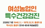 담양군 클릭뉴스2026. 03.13[클릭뉴스]옹진군은 올해 처음으로 여성농업인의 건강권 보호를 위한'여성농업인 특수건강검진사업'을 본격 시행한다고 밝혔다. 이번 사업은 농작업으로 인해 근골격계 질환 등 직업성 질환에 취약한 여성농업인을 대상으로 건강검진 및 예방 상담을 지원하는 사업으로 여성농업인의 삶의 질 향상과 안정적인 영농 활동을 지원하기 위해 추진된다. 지원 대상은 옹진군에 거주하며 농업경영체에 등록된 짝수년도 출생의 51세부터 80세까지 여성농업인으로, 올해는 총 60명을 대상으로 실시되며, 검진 비용은 1인당 22만 원이며, 이 중 19만8천 원은 …