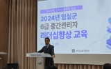 임실군 클릭뉴스2024. 12.04[클릭뉴스] 임실군이 지난 3일 대표 관광지인 치즈테마파크 지정환 홀에서 6급 공무원 60여 명을 대상으로‘중간관리자 리더십 교육’을 실시 했다. 이번 교육은 급변하는 환경 속에서 새내기 공무원들이 공직사회에 대한 적응력을 높이는 데 도움을 주고, 부서장과 팀원을 연결하는 중간관리자로써의 리더십 함양을 위해 마련됐다. 교육 내용은 조직을 유연하게 만드는 리더의 소통십, 조직문화 개선을 위한 스피치 대화 기법, 팀 빌딩 활동으로 소통과 화합 증진 등에 대한 강의와 실습 과정으로 외부 전문 강사가 맡아 진행했다. 설상희 부군…